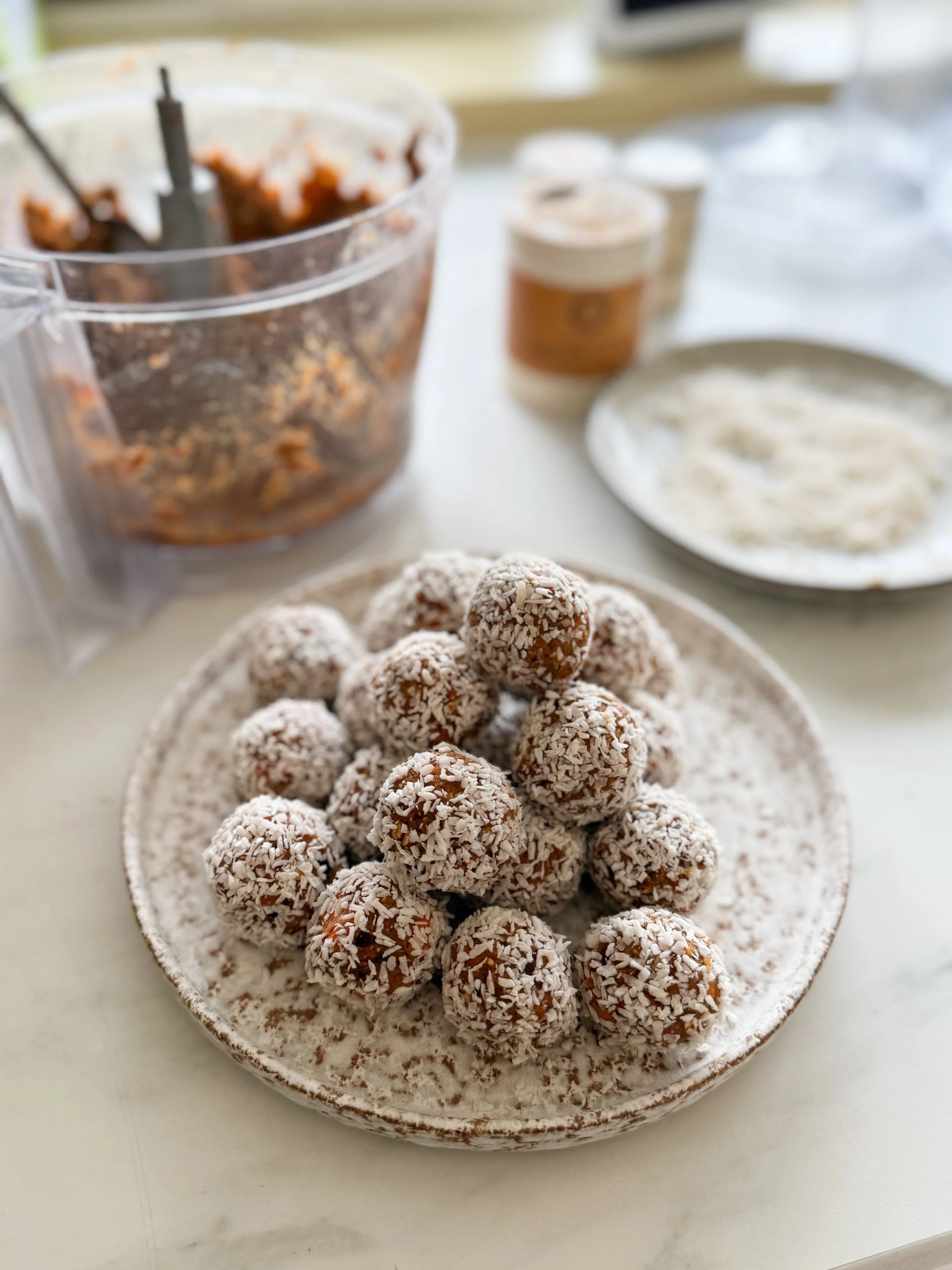 Ha alle ingrediensene i en foodprosessor, og kjĂžr til en jevn deig som kan rulles til kuler.
