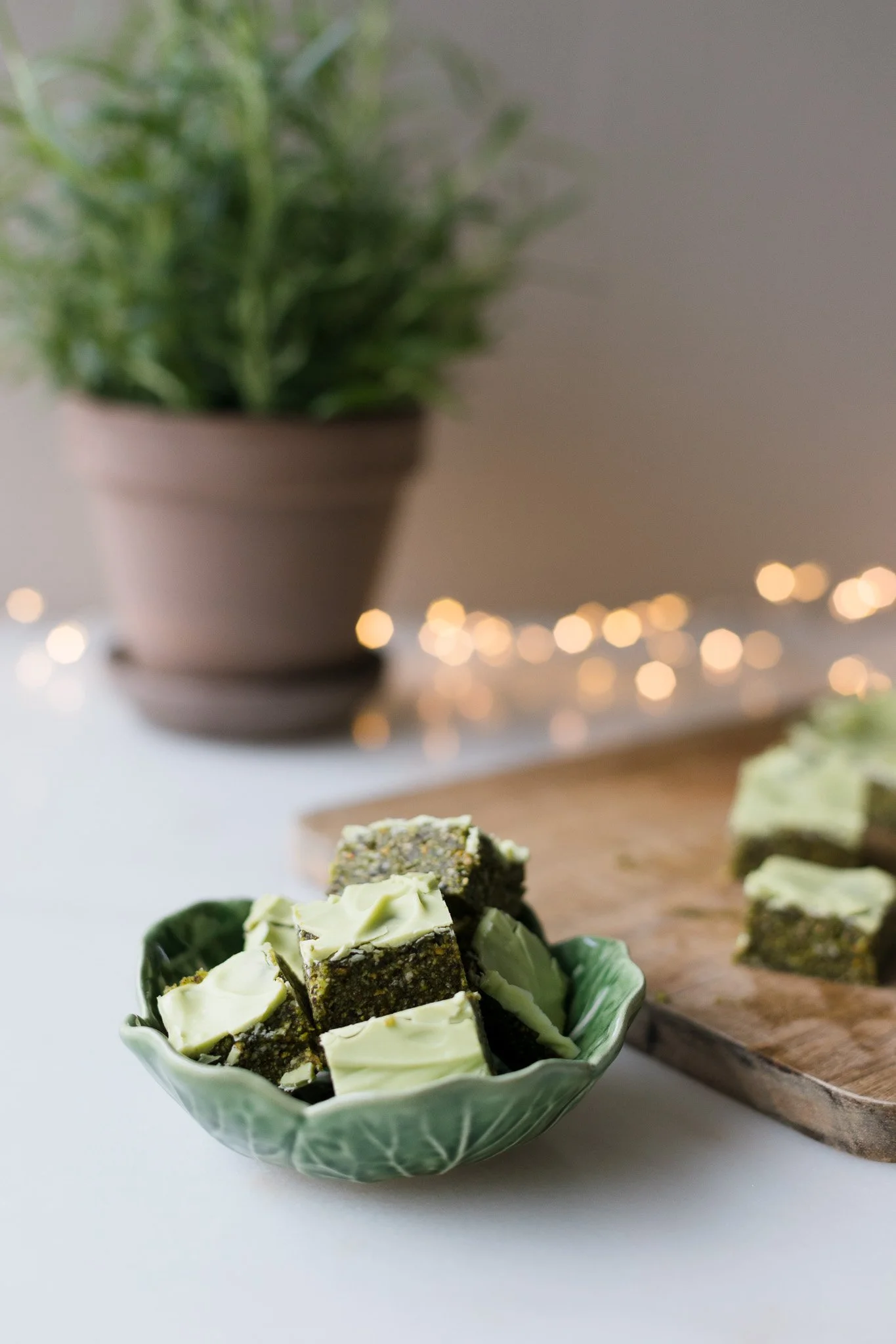 Rull kuler og spis de som de er, eller for ekstra luksus: trykk ut i en liten form, smelt hvit sjokolade med et dryss matcha og topp over formen.