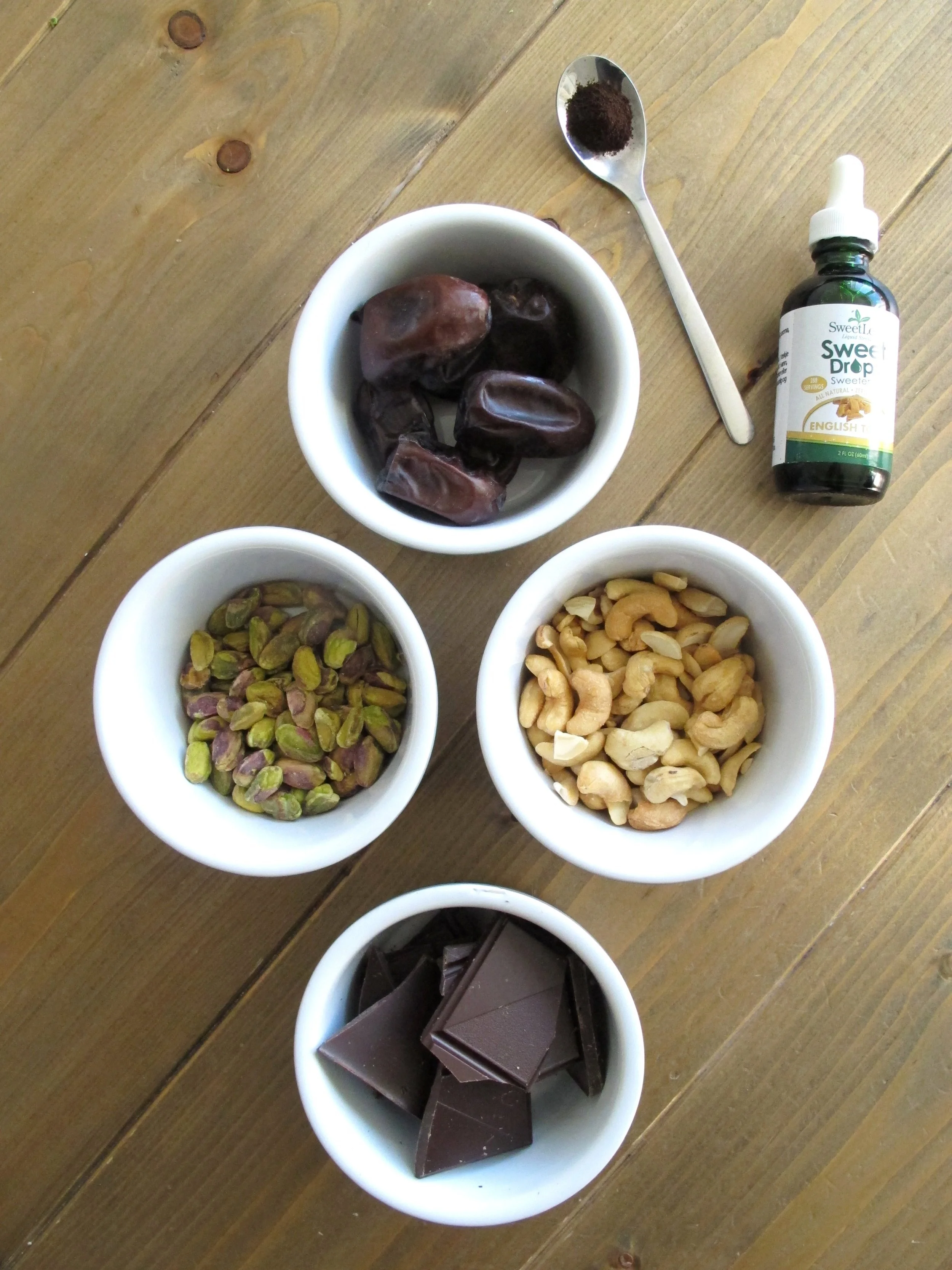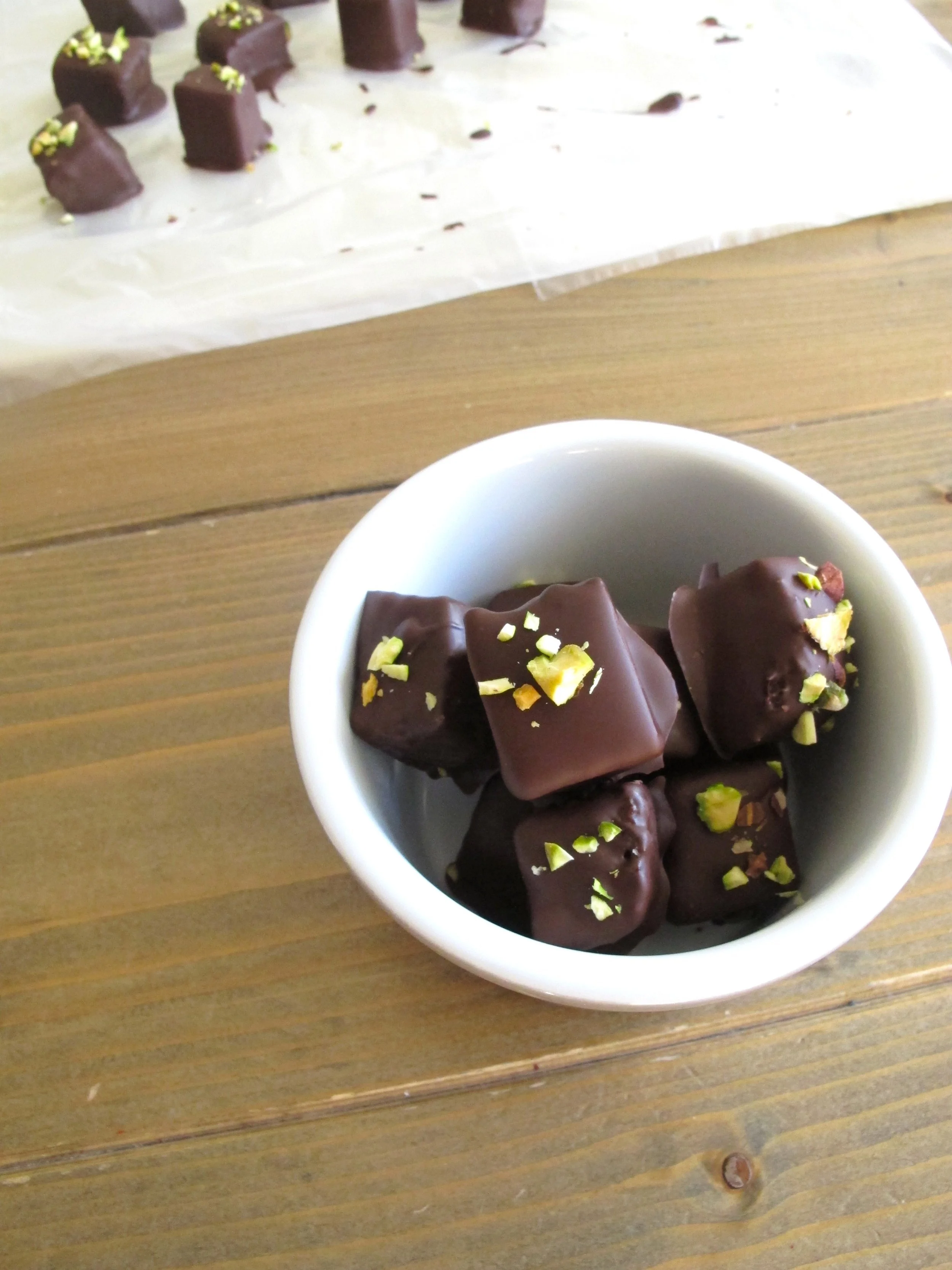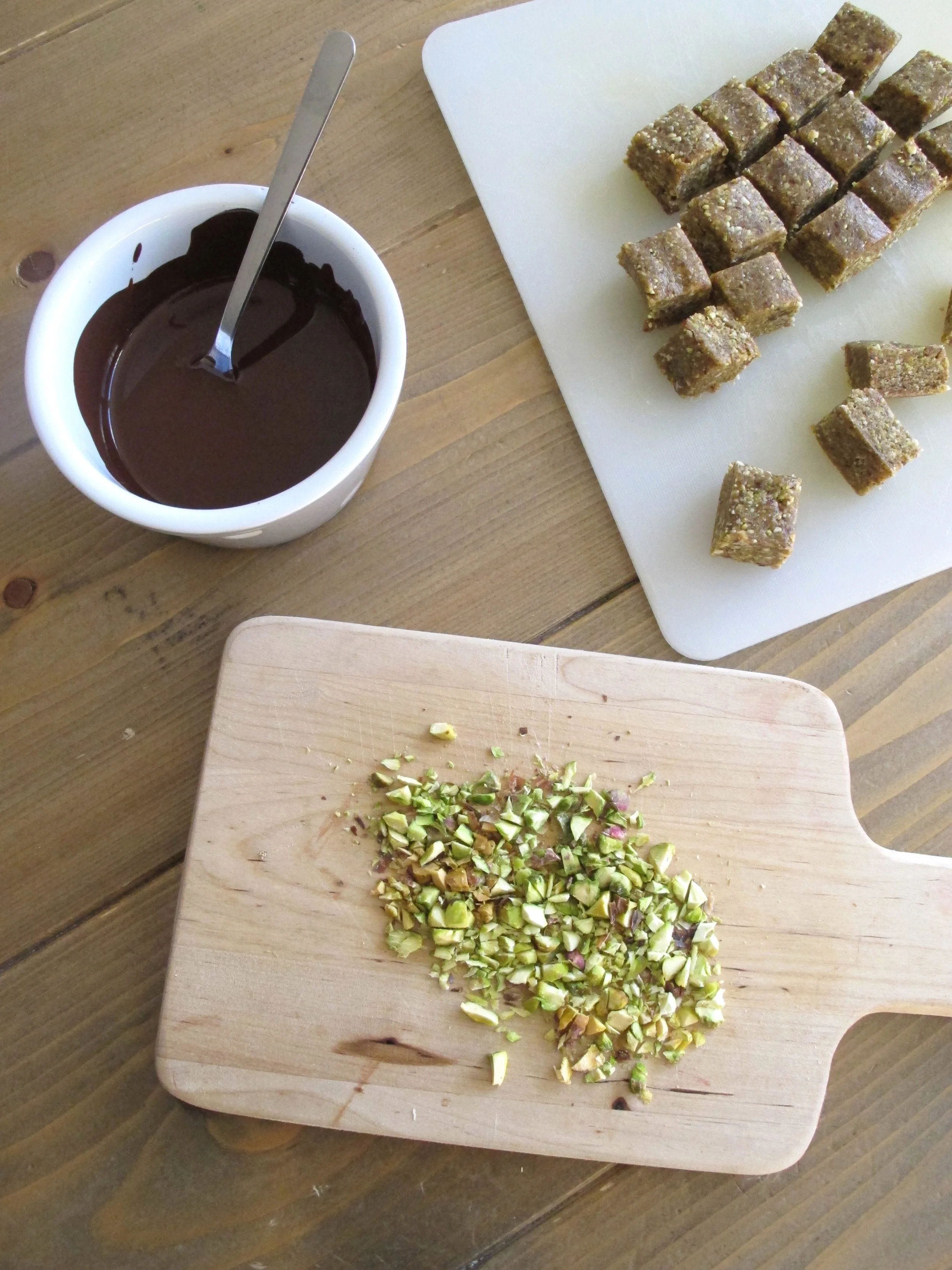 Sleng alle ingrediensene unntatt sjokoladen i en blender eller en beholder som hører til stavmikseren din. Blend i vei til en fast klebelig masse. Trykk massen ut i en silikonbrødform eller annet. Jeg brukte litt over halve brødformen siden jeg ville ha de kvadratiske (ca 2,5 cm høye). Sett i fryseren i en halvtime mens du smelter sjokoladen i vannbad. Del i terninger, dypp i sjokoladen og dryss gjerne litt hakkede pistasjenøtter over! SMAKER HIMMELSK!