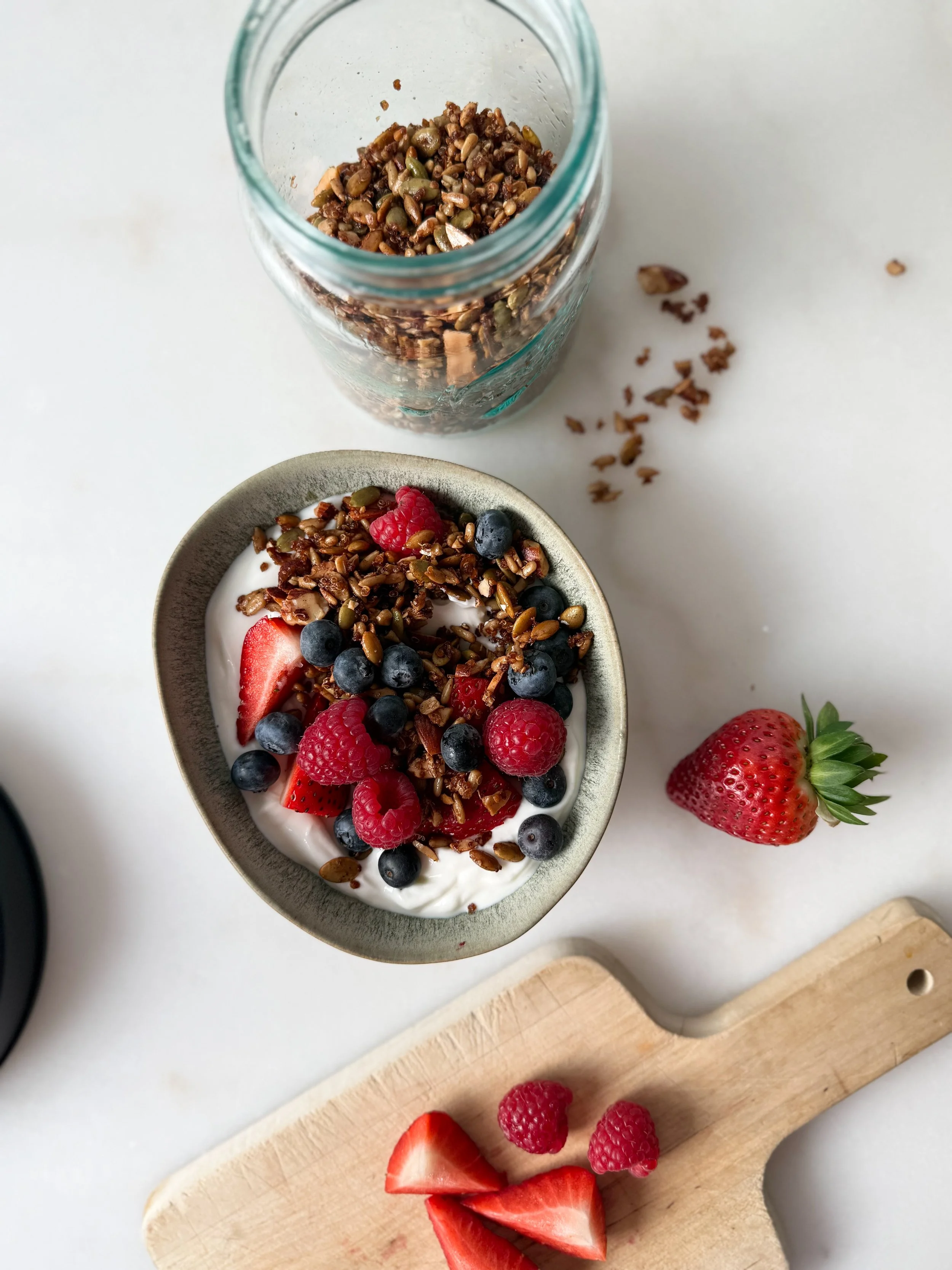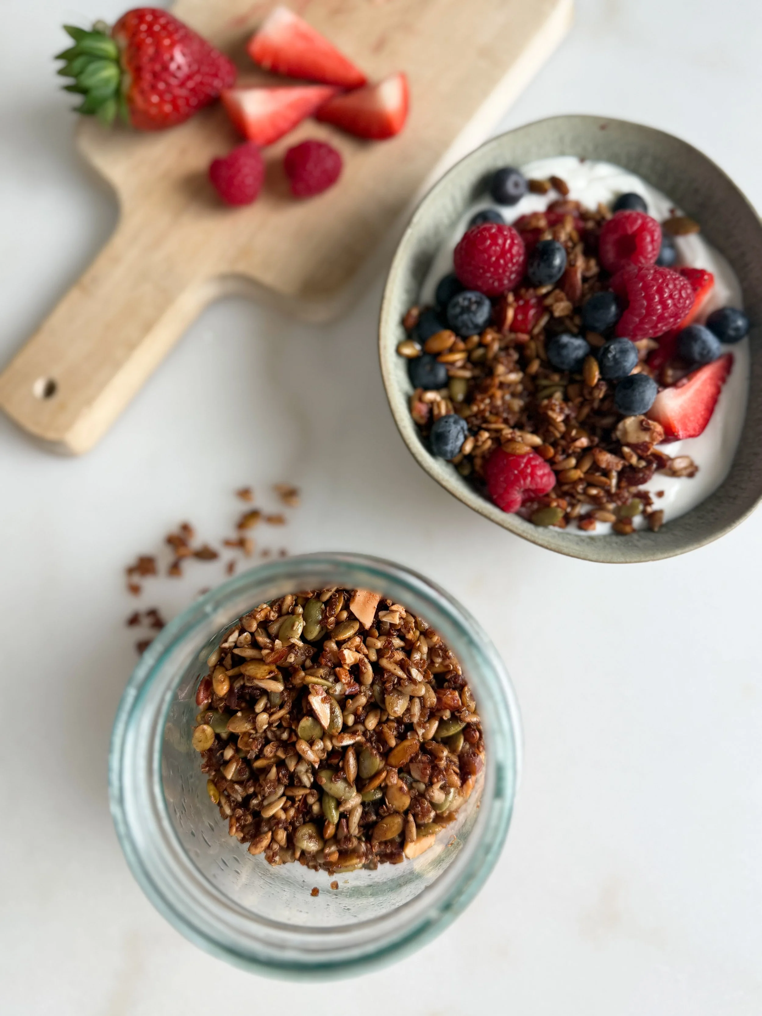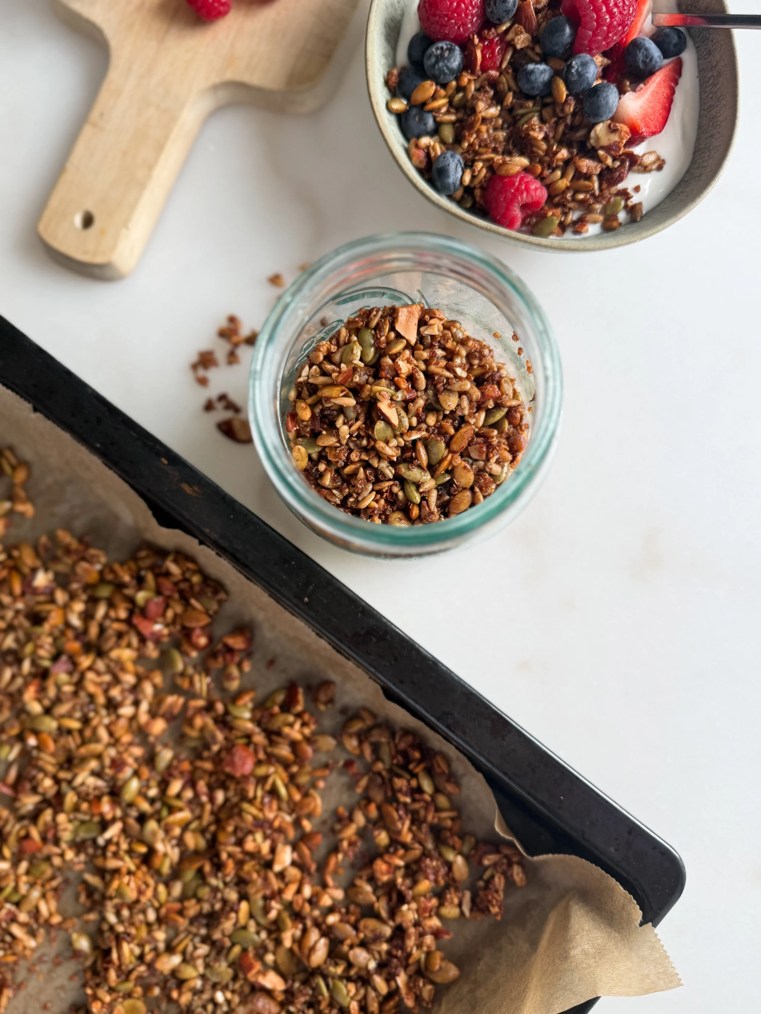 Her får du altså en granola oppskrift full av gode byggeklosser. Massevis med fiber, gode fettsyrer og protein. En blodsukkervennlig knasende god granola!