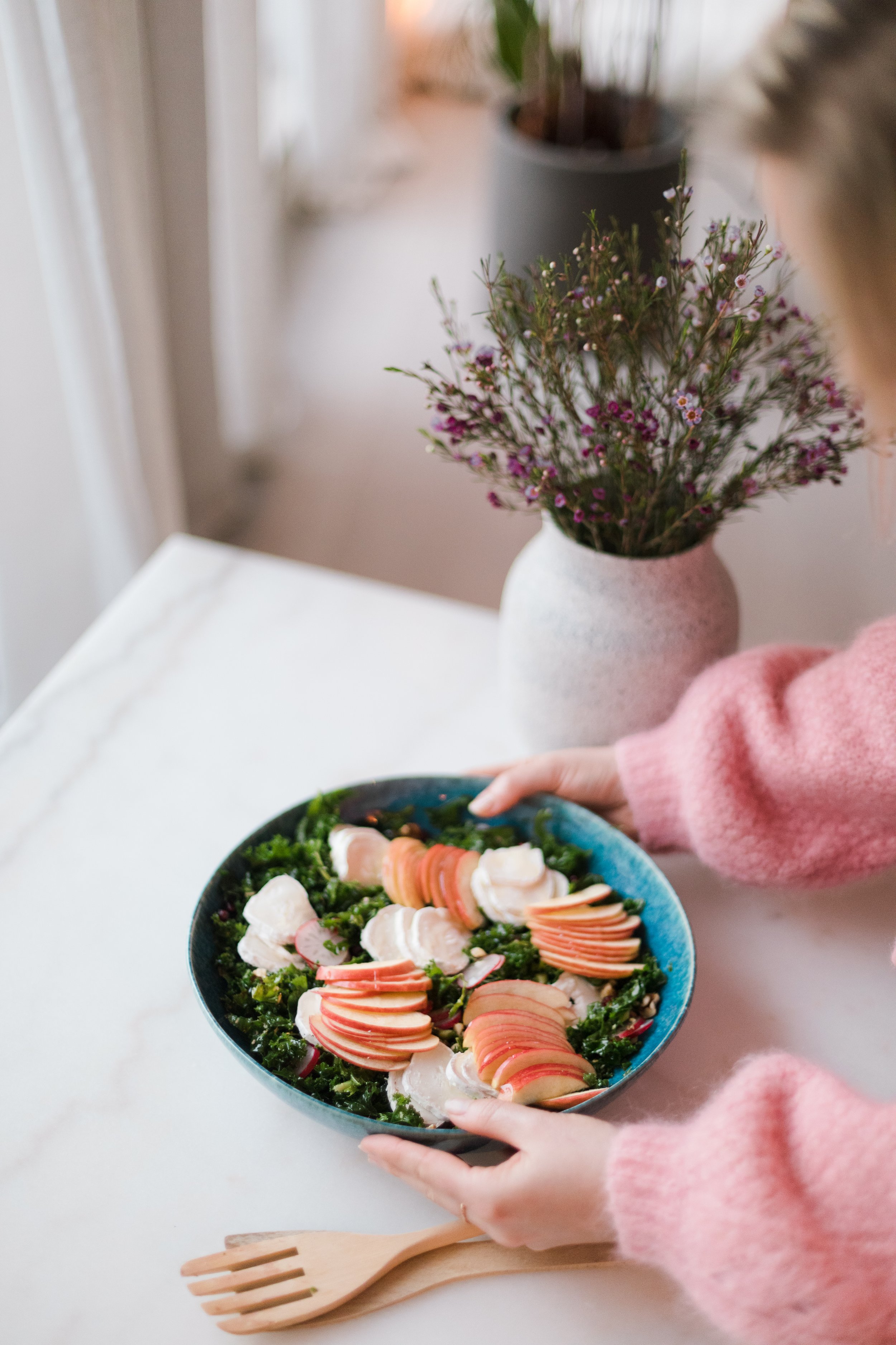 Del eplet (og evt reddik) i tynne skiver. Del chevren. Topp dette på salaten sammen med granateplekjernene.