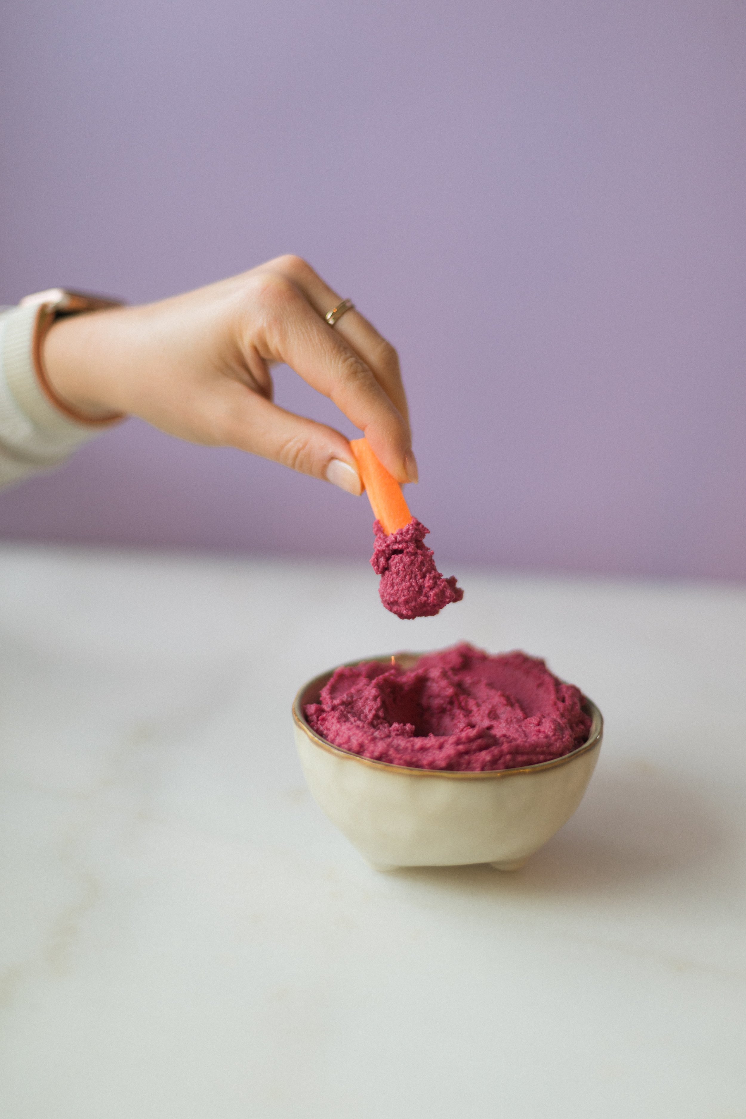 2. Skrell rødbete og tilsett resten. Kjør til en jevn røre i blender/foodprosessoren.