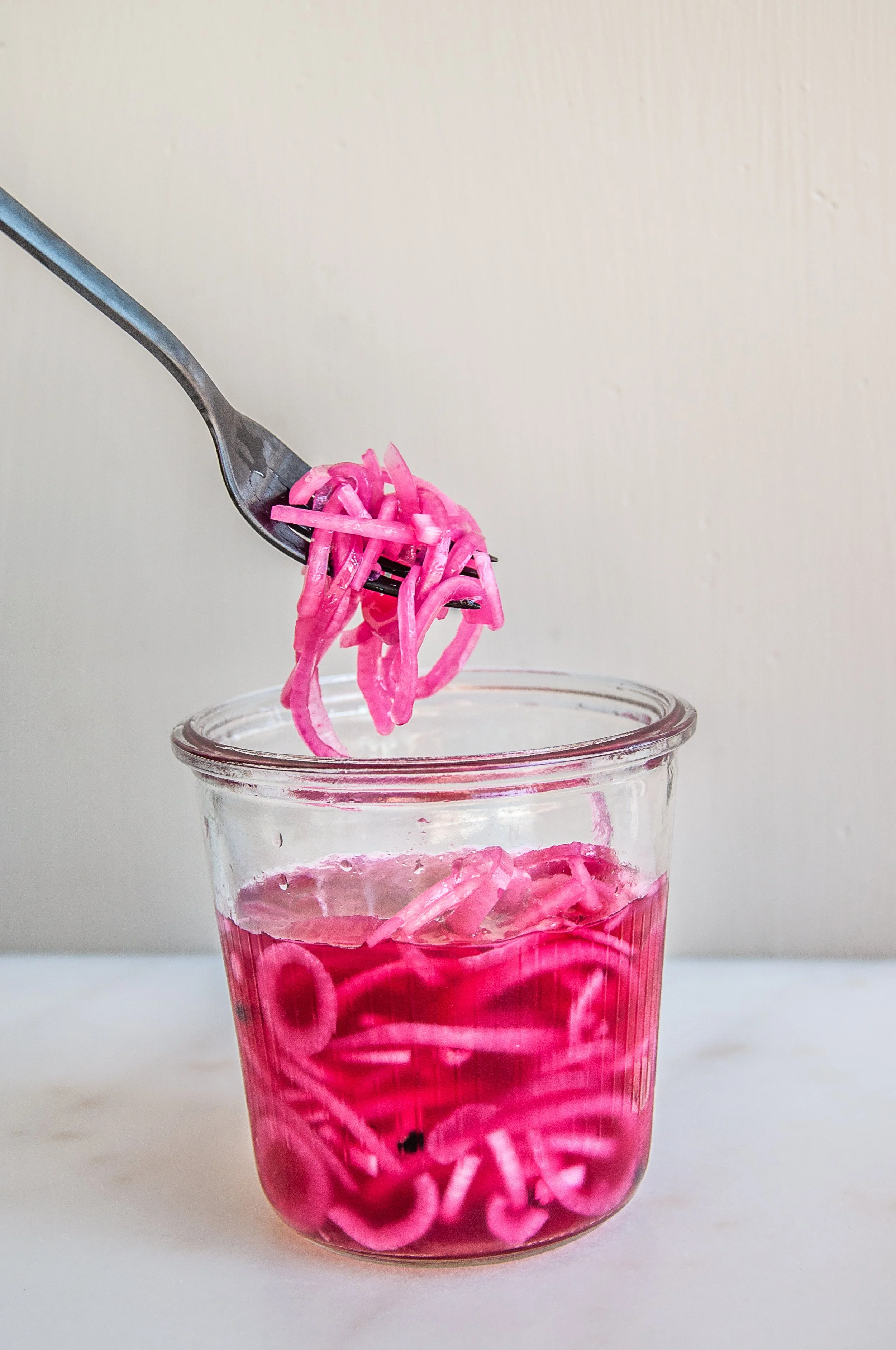 Til en glasskrukke syltet rødløk: